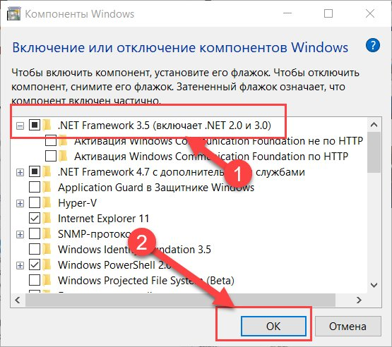 5. Выберите .NET Framework 3.5 (включая 2.0 и 3.0) и нажмите кнопку "ОК"<br>